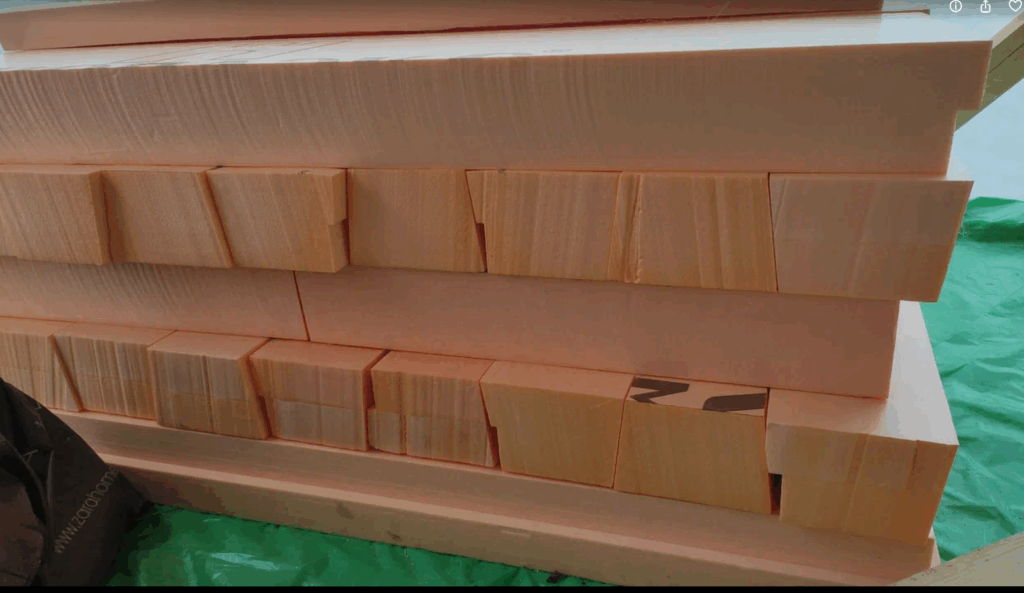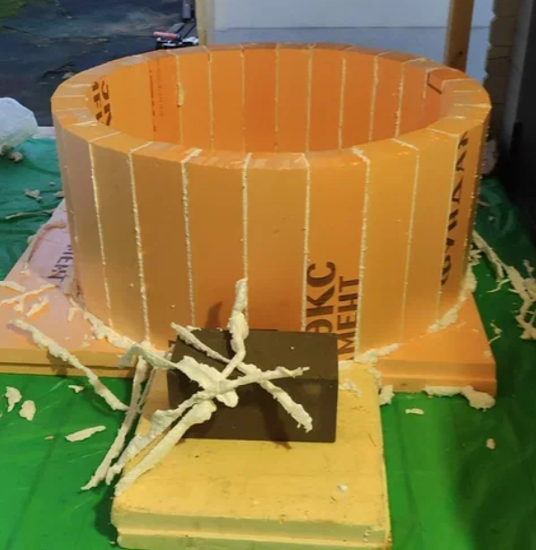 В качестве материала был выбран достаточно плотный и крепкий «Пеноплэкс Фундамент» толщиной 100 мм. Форма шапочки — колпак, стены по окружности с внутренним диаметром 1090 мм. Высота стен 580 мм, состоят из 28 элементов в сечении имеющих вид трапеции.