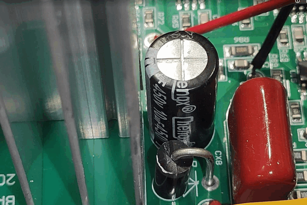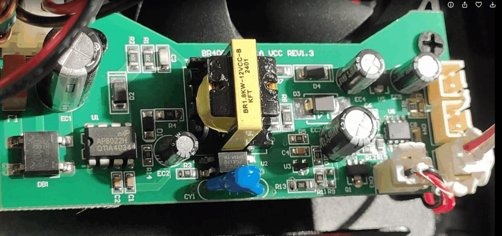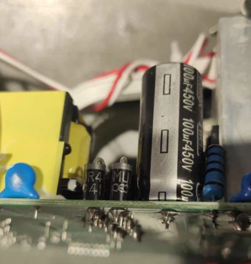Схемотехнически основной источник состоит из 2- ступеней. Первая ступень — импульный преобразователь типа LLC Half Bridge с выходной емкостью 100 мкФ 450В: