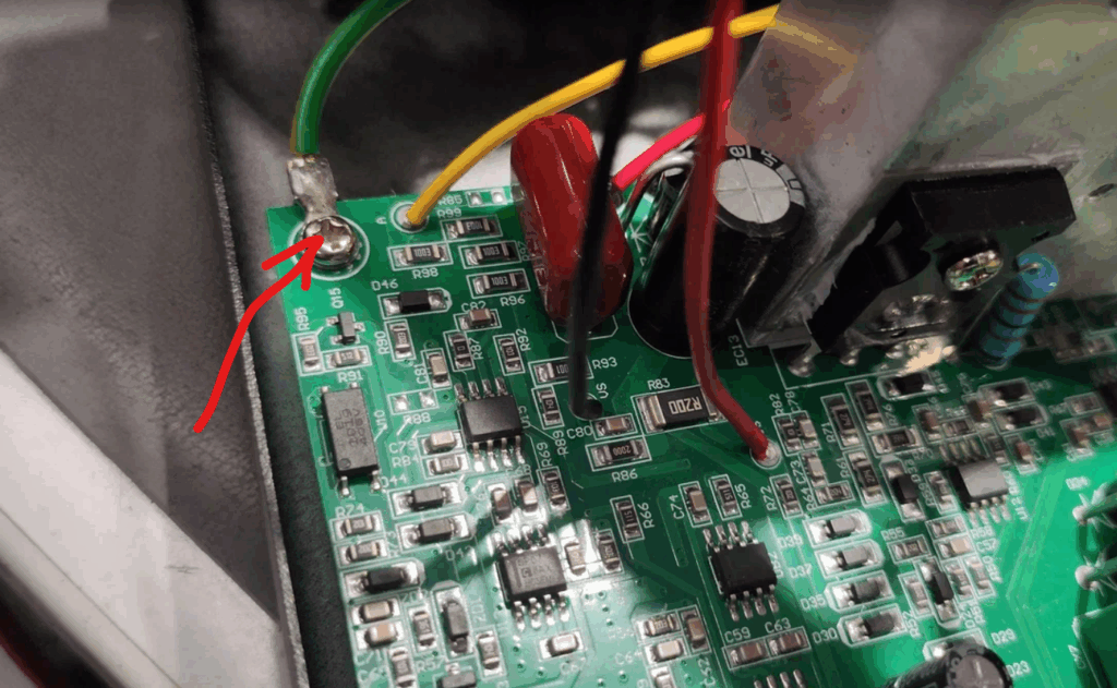 Линия заземления проходит от разъема питания 220В через металлический корпус на среднюю клемму фронтальной панели: