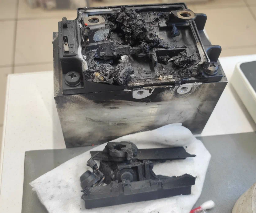 Поступивший модуль был достаточно сильно загрязнен. Внутри взорвавшаяся силовая сборка 2MBI150N-120: